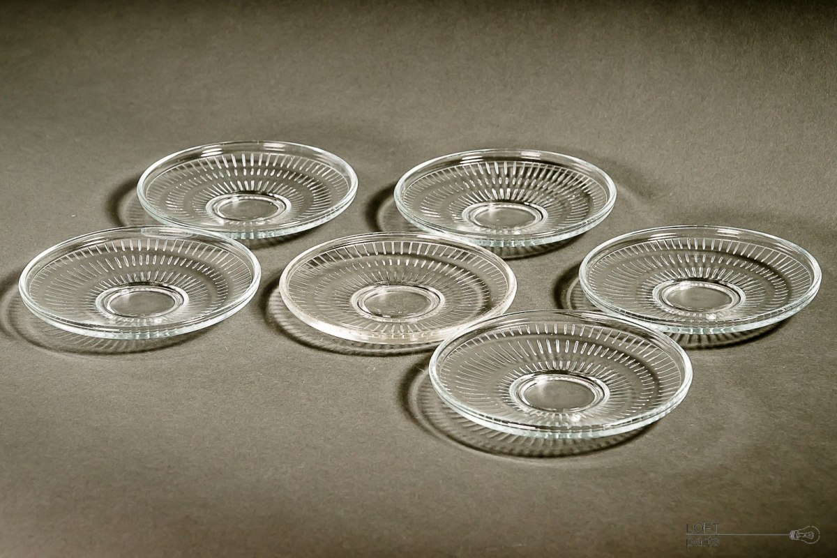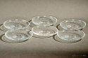 Komplet sześciu bezbarwnych talerzyków z prostym, geometrycznym motywem.