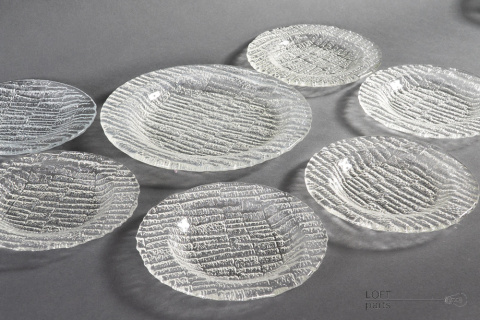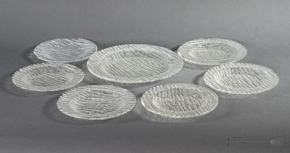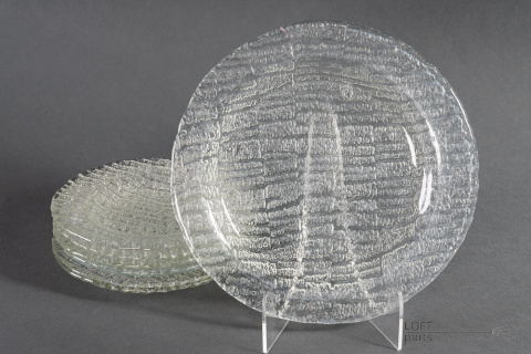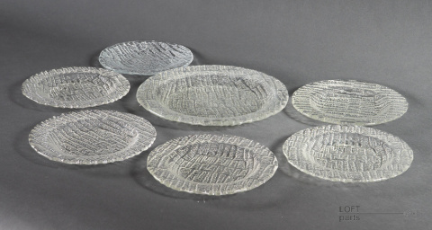 Bezbarwny zestaw 6+1 ''Igloo'' zaprojektowanych przez Erykę Trzewik-Drost, a wyprodukowanych w Hucie Szkła Gospodarczego Ząbkowice. Jeden z talerzyków ma ślady użytkowania w postaci rys i przetarć.