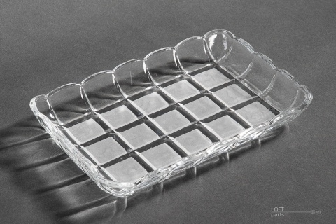 A colourless tray with a matte bottom produced in the Morawski Glassworks in Radomsko. In the catalogue of the glassworks, it is numbered 66.