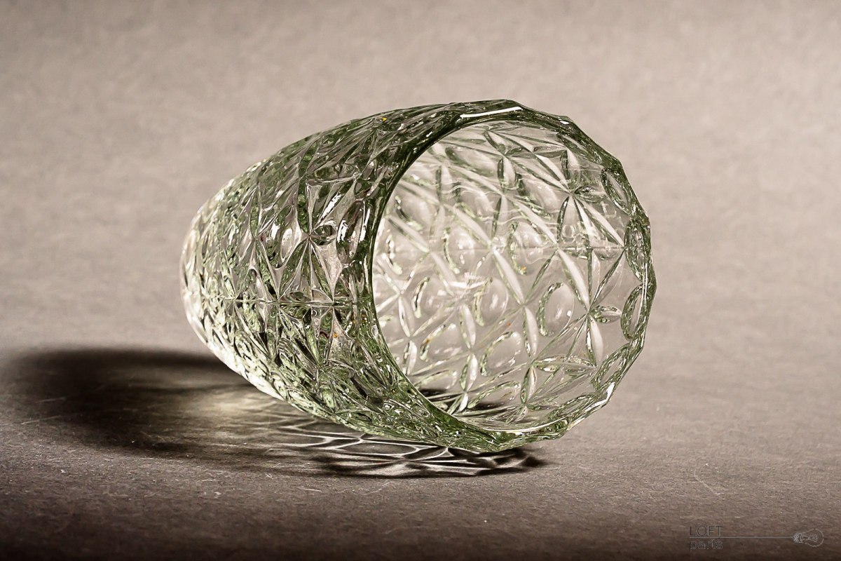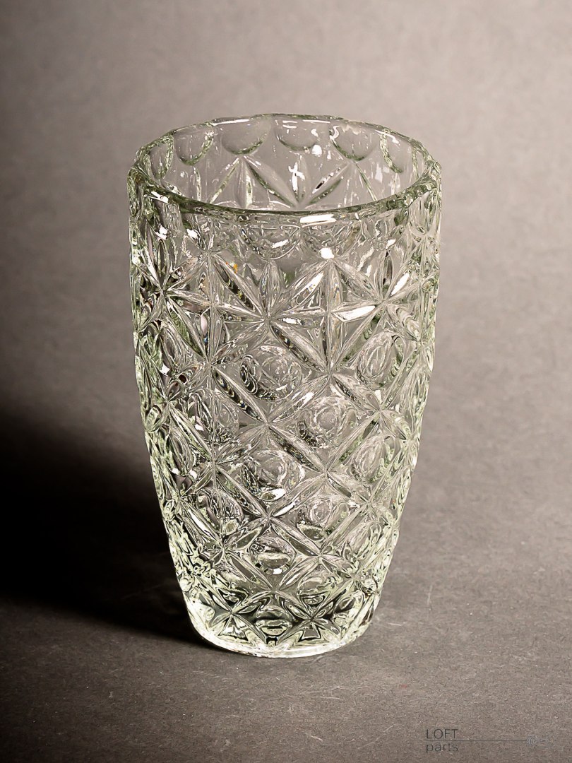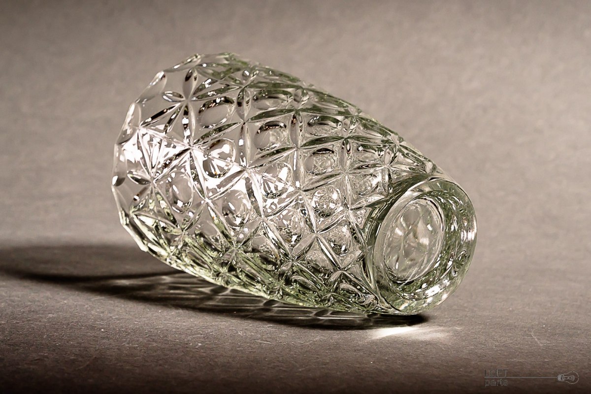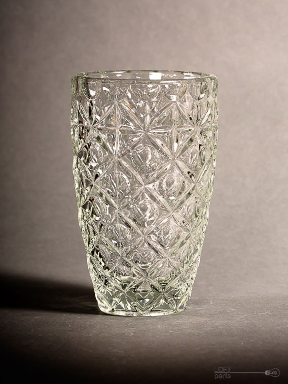 Bezbarwny wazon wyprodukowany w Hucie Szkła Gospodarczego Hortensja.