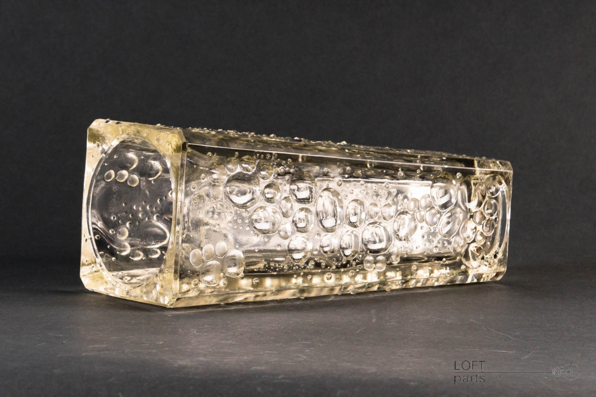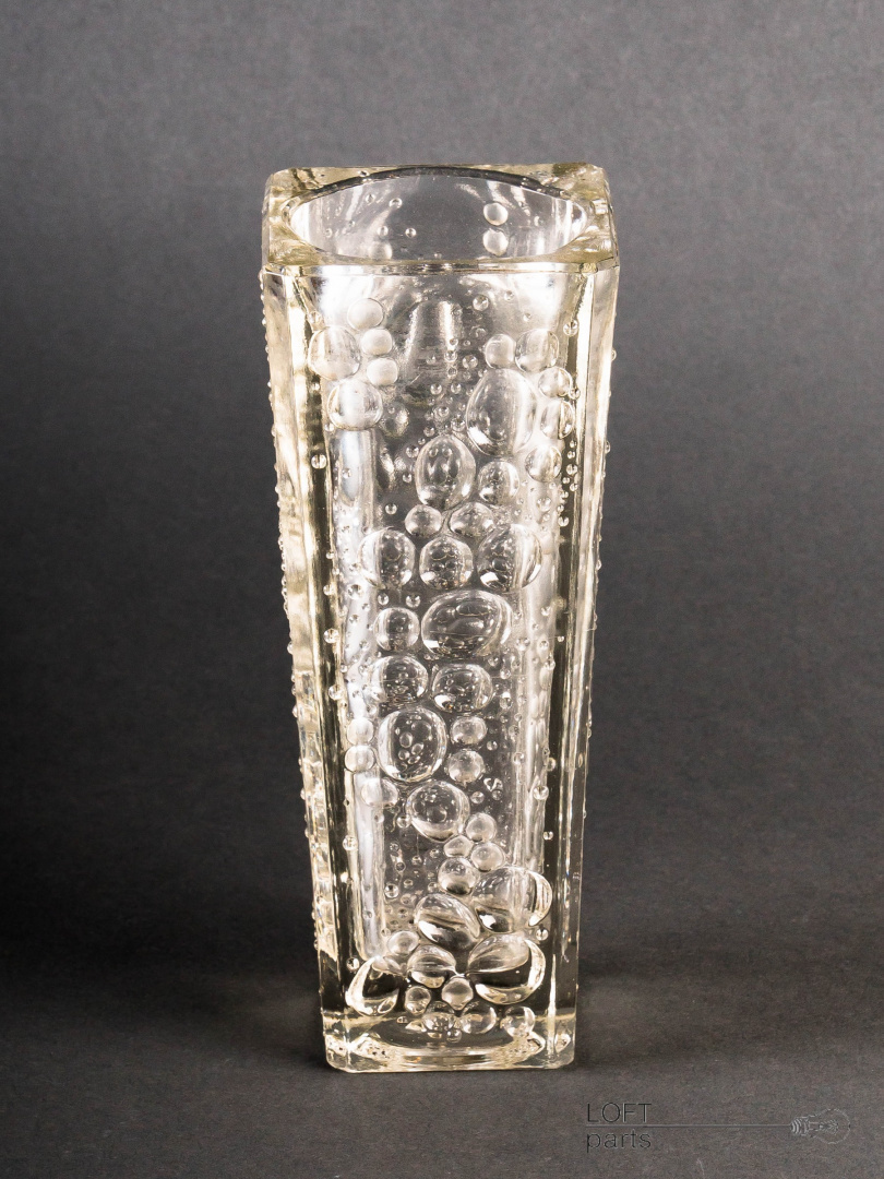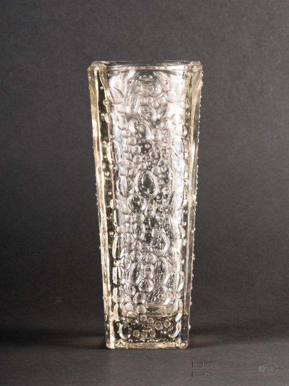 Bezbarwny wazon wyprodukowany w Hucie Szkła Gospodarczego Hortensja.