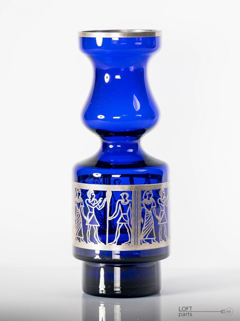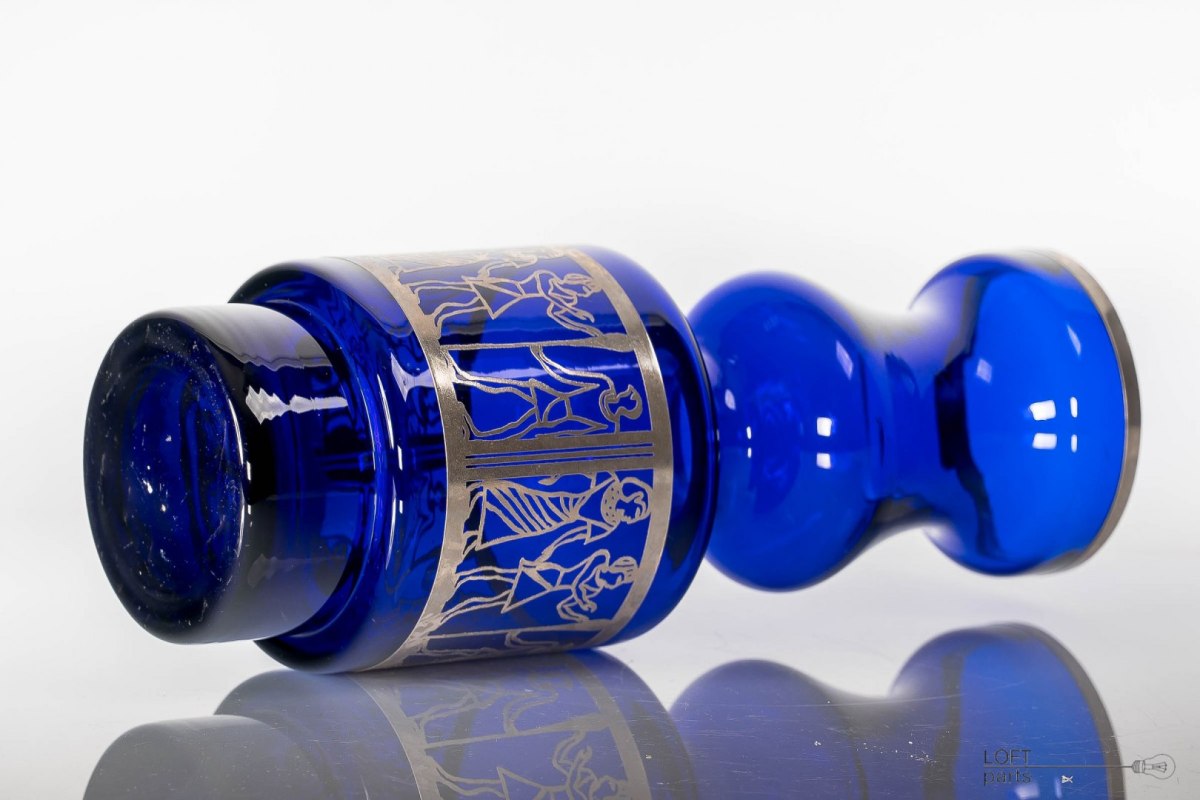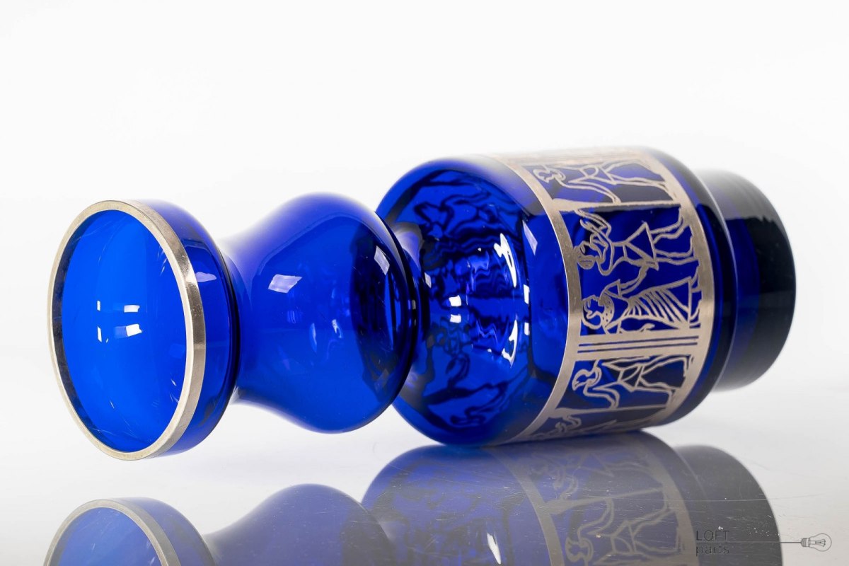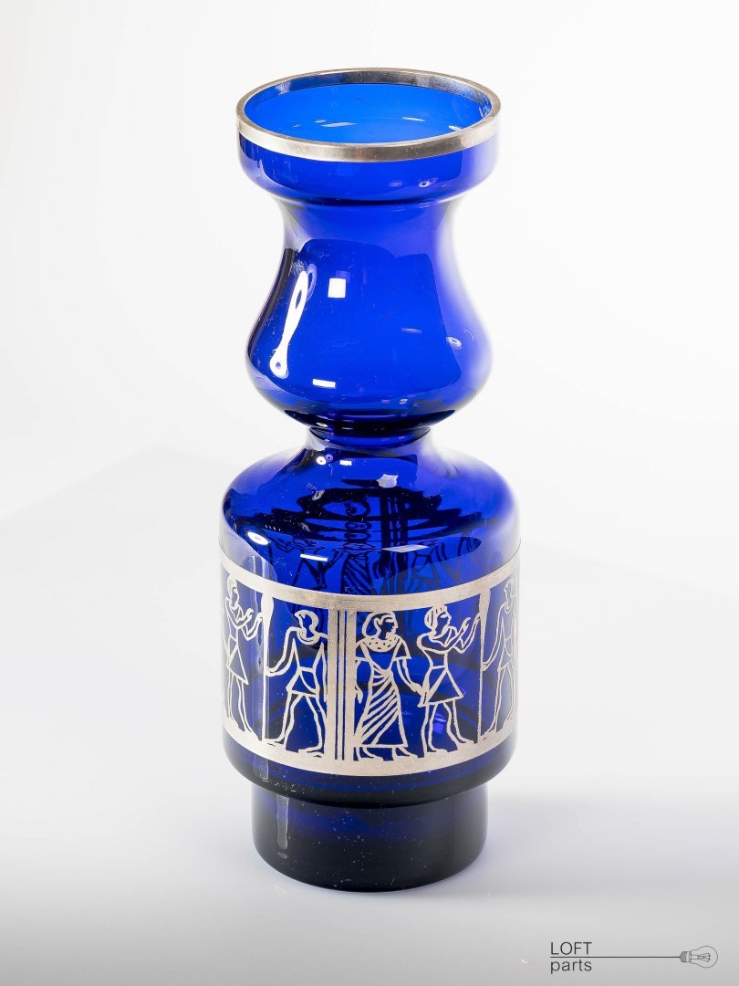 Kobaltowy wazon wyprodukowany w Hucie Szkła Gospodarczego Hortensja. Wazon otoczony metalowym zdobieniem wykonanym w technice silver overlay.