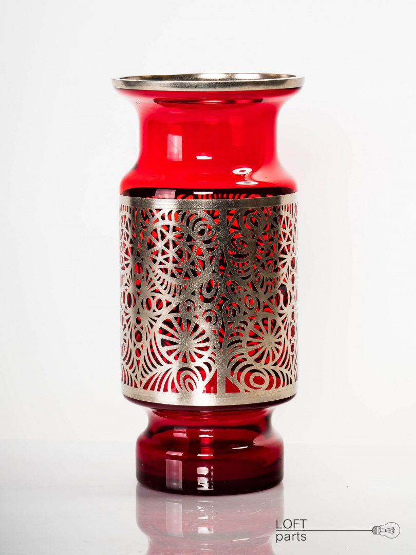 Czerwony wazon wyprodukowany w Hucie Szkła Gospodarczego Hortensja. Wazon otoczony metalowym zdobieniem wykonanym w technice silver overlay.