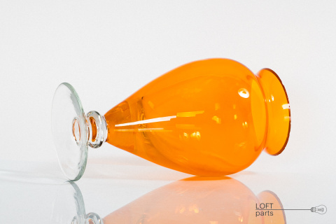 Orange vase with a colourless foot designed by Ludwik Fiedorowicz. Manufactured in the Ząbkowice Household Glass Factory. The vase has a few small chips on the top edge (visible in the photos).