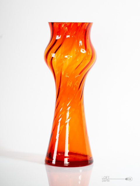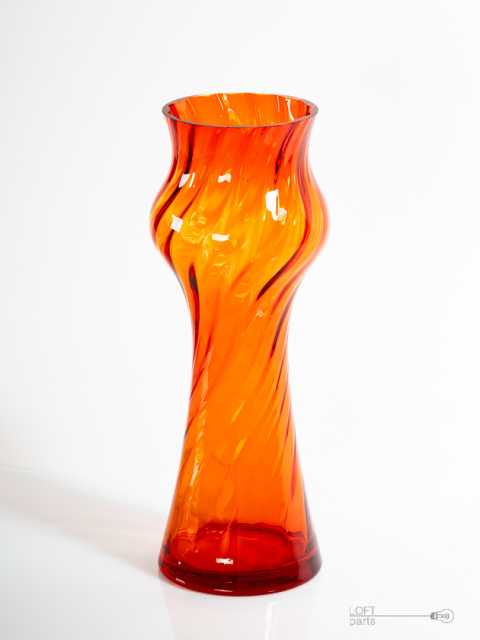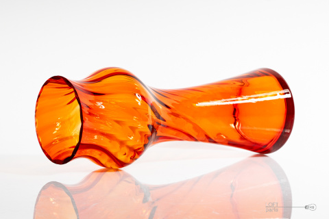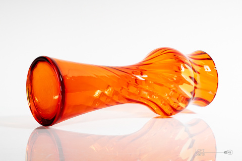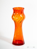 Czerwono-pomarańczowy wazon zaprojektowany przez Ludwika Fiedorowicza. Wyprodukowany w Hucie Szkła Gospodarczego Ząbkowice.
