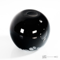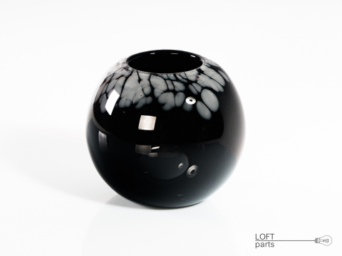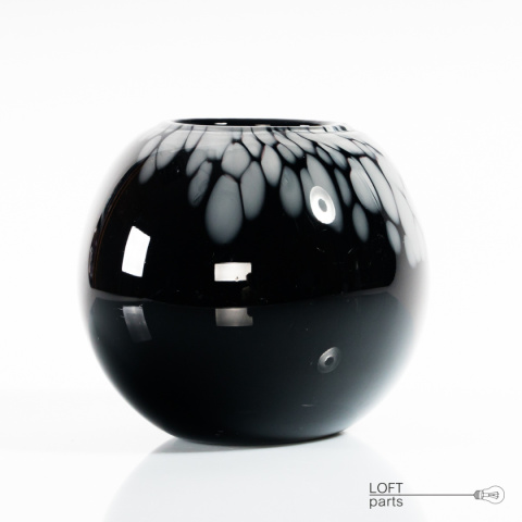 Kulisty, czarny z białymi plamkami wazon wyprodukowany w Krośnieńskich Hutach Szkła. Wazon ma na obwodzie bezbarwne oko o średnicy kilku centymetrów.