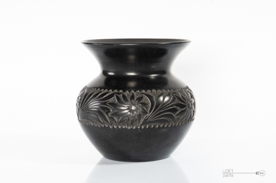 Czarny wazon z kwiatowym reliefem.