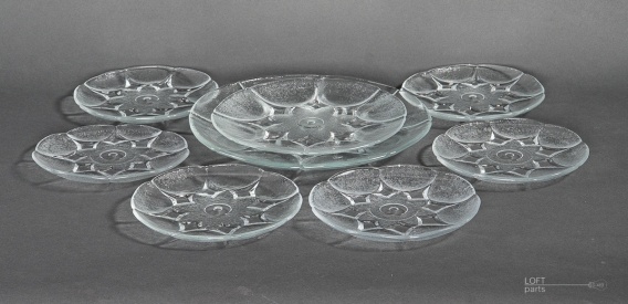 Colourless dessert set ''Stella''' consisting of two platters and six plates produced in Ząbkowice Household Glass Glassworks. Designed by Eryka Trzewik-Drost. The set is completed with the ''Piramida'' plate elements (has additional small wheels in the middle of the plates).