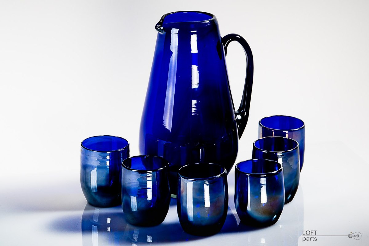 A cobalt cold drink set consisting of a jug and six glasses. Delicately iridescent, sanded bottoms. Unfortunately, I don't know its origin.